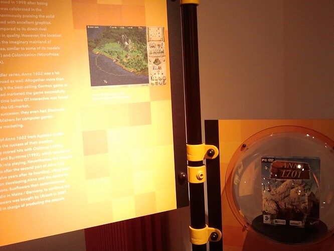 Zu den Zeitpunkt gab es eine Sonderausstellung über Videospiele deutscher Herkunft. Informationstafeln standen aus, waren mit Screenshots bestückt und erzählten von berühmten Reihen wie Die Siedler oder Anno. Unter Verschluss gab es daneben Spieleverpackungen mit Unterschriften der Entwickler. Man hatte auch die Möglichkeit Turrican (1 oder 2, ich weiß es nicht) sowie Edna bricht aus zu spielen. Gewiss wurde auch über weniger bekannte Marken ein Wort verloren.