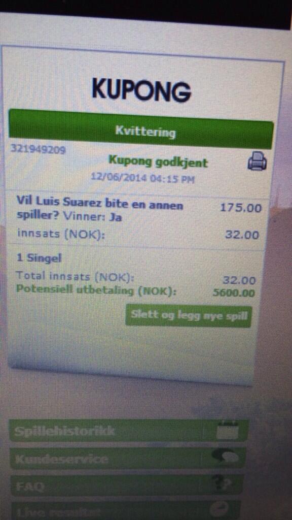 Ein Norweger hat ca 3,75€ drauf gewettet das Suarez während der Partie wieder mal Hunger bekommt. Ausgezahlt wurden im bei einer Quote von 1:175 ca 675€.