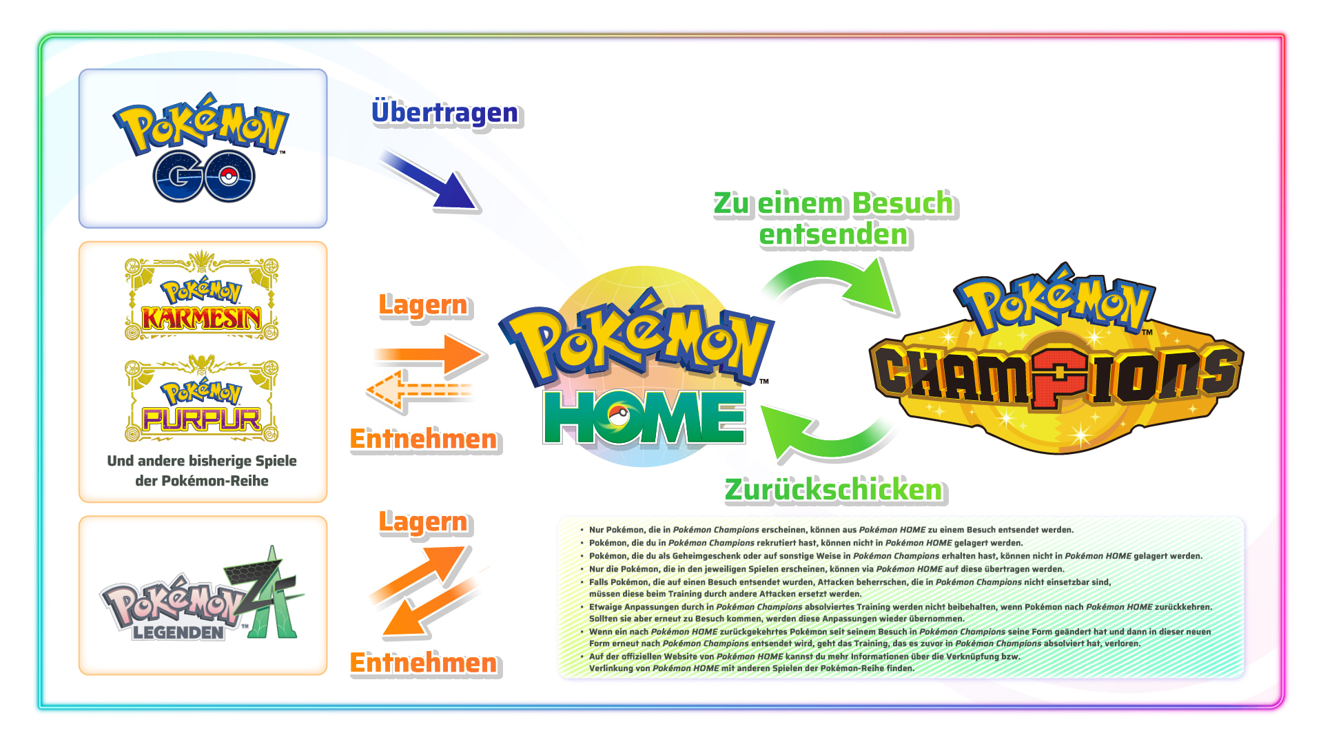 - HOME Integration: Eine “kopie” eurer Pokémon kann von HOME zu Champions ausgestellt werden. Ihr habt das Pokémon dann in Champions und könnt es nach belieben anpassen. Euer Pokémon bleibt dabei aber weiterhin in HOME und belegt weiterhin einen Platz in eurer Box und kann nicht in andere Spiele verschoben werden solange es noch in Champions ist. Änderungen, die ihr an euren Pokémon vorgenommen habt bleiben nur in Champions gespeichert. Schickt ihr euer Pokémon zurück nach HOME nimmt dieses wieder die vorherigen Statuswerte usw. an. Schickt ihr es später nochmal nach Champions werden wieder die Werte von Champions übernommen, es sei denn die Form des Pokémon hat sich zwischenzeitlich geändert.