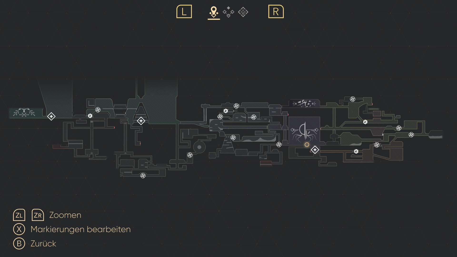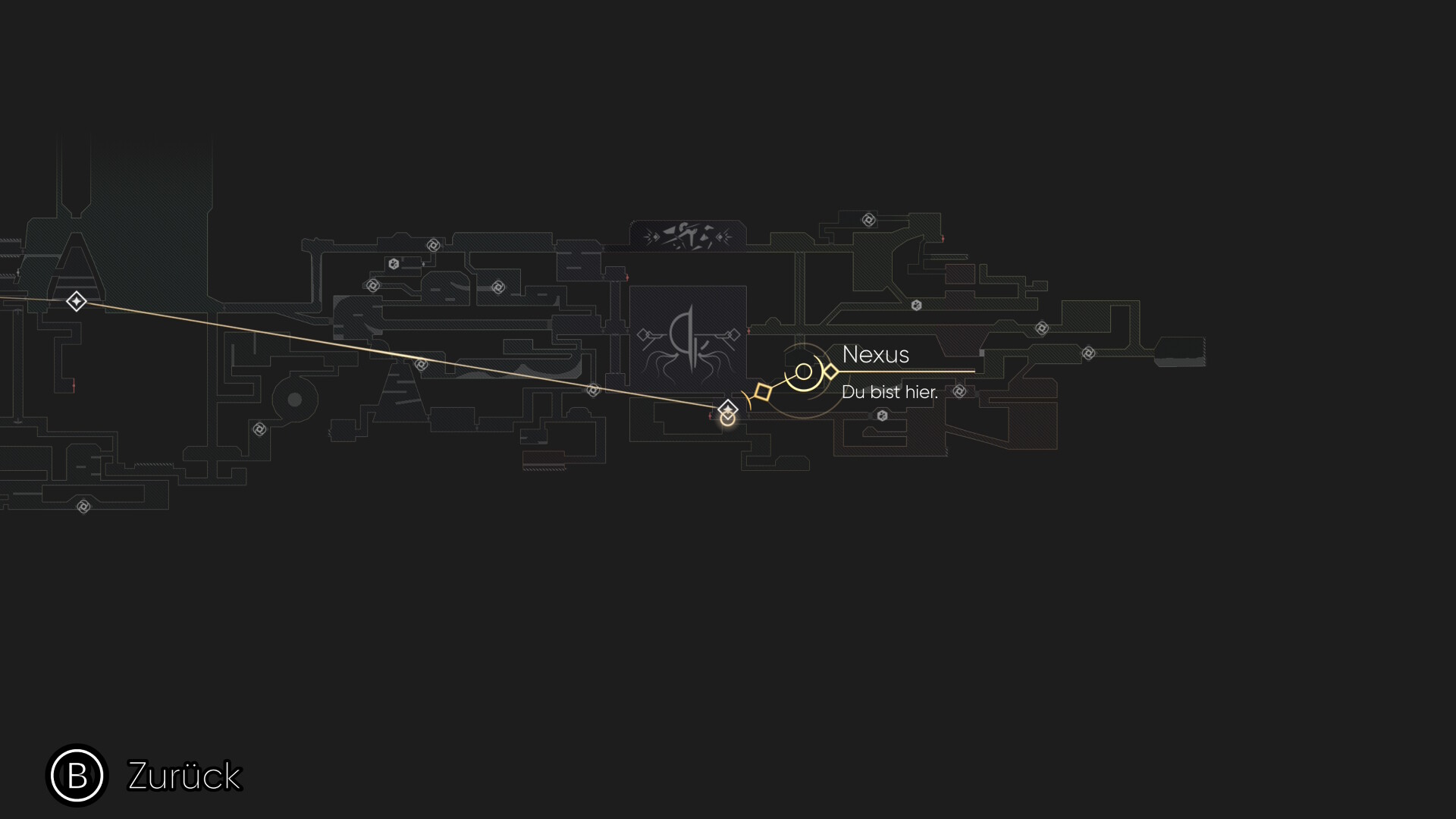 Aber nicht ganz - es geht um die Rauten, die auf der zweiten Abbildung miteinander verbunden sind. Das sind die Checkpunkte des Spiels, an denen man sein Equipment wechseln kann, schnellreisen kann, seine Karte updaten kann und zu denen man zurückgeschickt wird, wenn man stirbt.